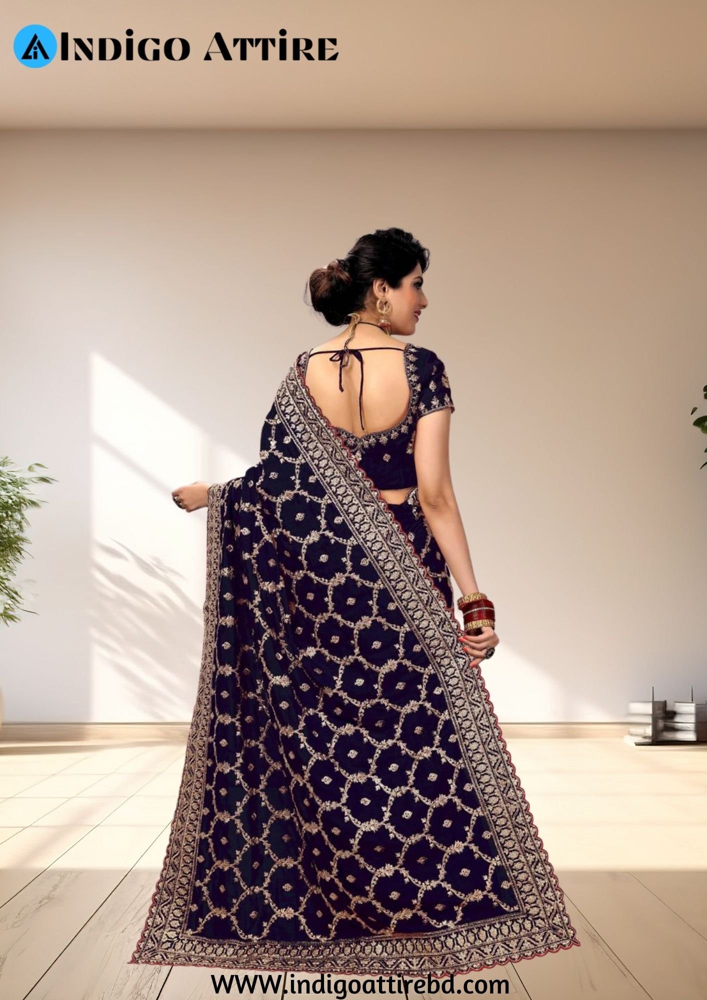 এই নীল কালারের শাড়ি টি ইন্ডিয়ান ওয়েটলেস সফট জর্জেট ফ্যাব্রিক দিয়ে তৈরী করা এবং সম্পূর্ণ শাড়ির আঁচল ও কুঁচি জুড়ে সিলভার কালার সুতার এমব্রয়ডারি কাজ এটিকে আরও আকর্ষণীয় করে তোলে এবং যেকোনো বিশেষ অনুষ্ঠানের পরিধানের জন্য উপযুক্ত।
